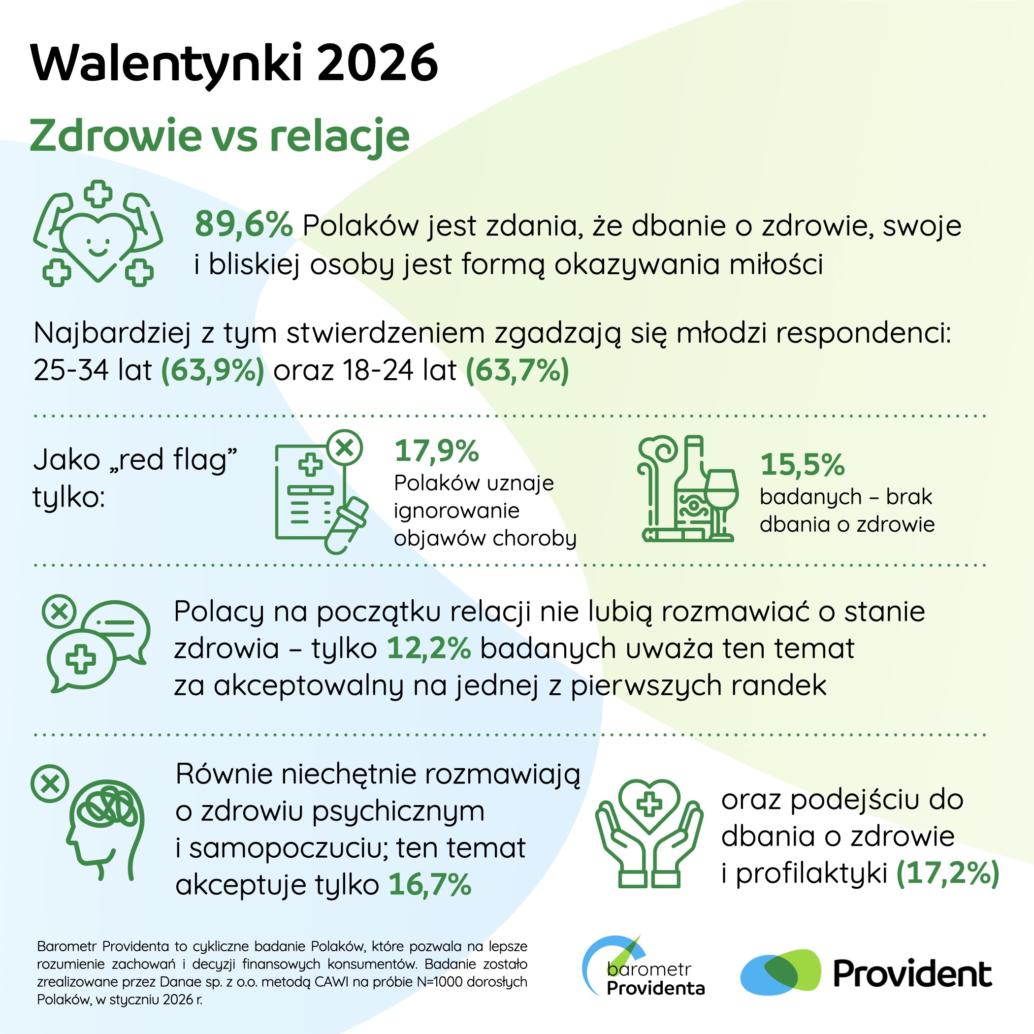 - Tabu związane z kwestiami zdrowotnymi znajduje odzwierciedlenie w tym, co Polacy uznają za „czerwone flagi” w zachowaniu swoich partnerów i partnerek. Najmniej niepokojący jest brak otwartości na rozmowę o zdrowiu – zaledwie 14,9 proc. badanych uważa to za sygnał ostrzegawczy – zauważa Karolina Łuczak, Rzeczniczka Prasowa Provident Polska. – Jest to ciekawy wyniki, bo z jeden strony nie niepokoi nas, że partner lub partnerka nie chcą rozmawiać o zdrowiu. Z drugiej zaś 89,6 proc. Polaków jest zdania, że dbanie o zdrowie, swoje i bliskiej osoby jest formą okazywania miłości. Przekonanie to jest najmocniejsze wśród najmłodszych, jednak różnice we wskazaniach są bardzo niewielkie między pokoleniami.