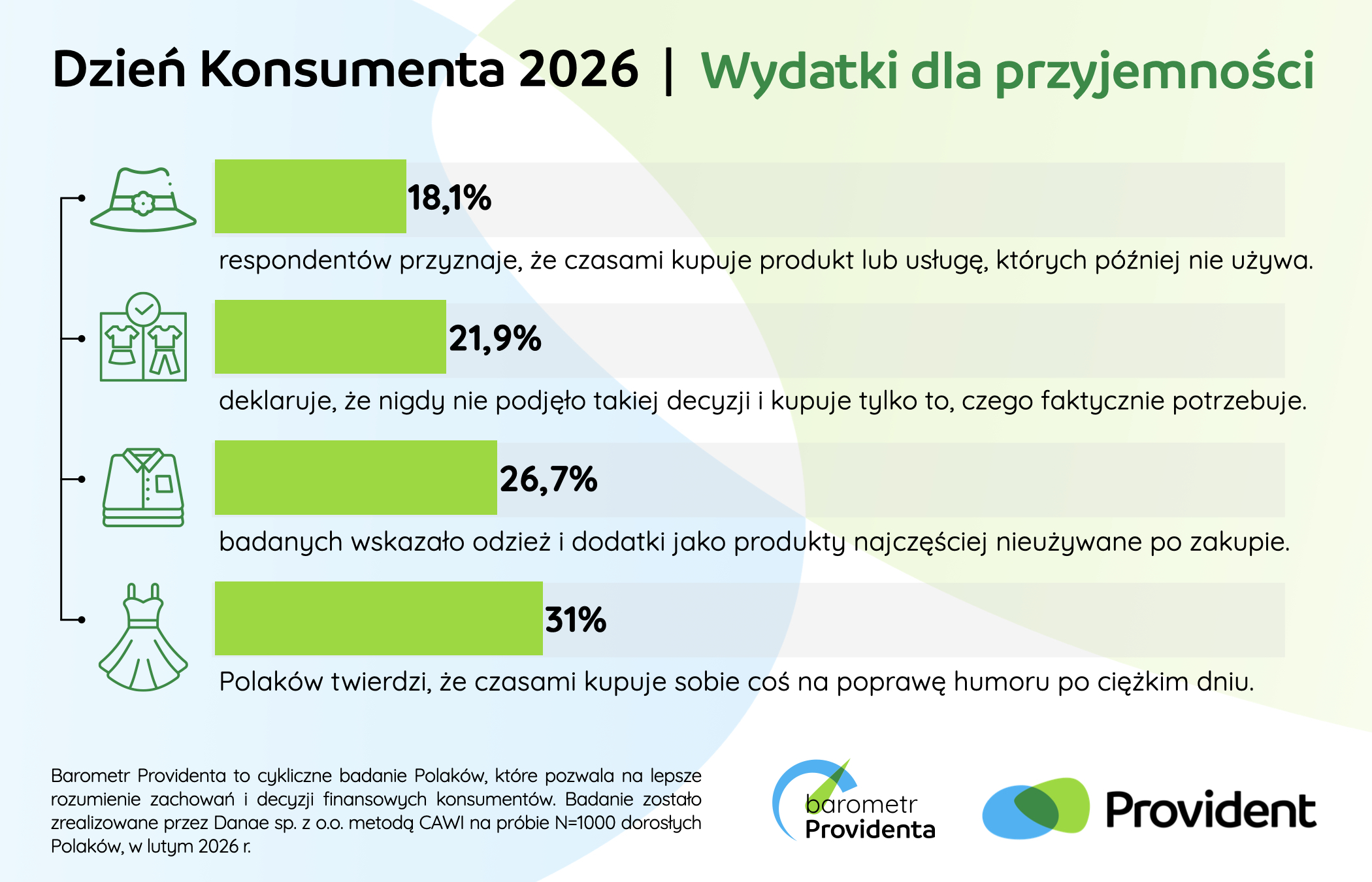 – Emocje w niektórych przypadkach nadal odgrywają wśród Polaków istotną rolę w decyzjach zakupowych. Szczególnie wśród młodych konsumentów – tylko 30 proc. z nich nie ma wyznaczonej kwoty, a 33,8 proc. rezerwuje miesięcznie 101–200 zł. Jednocześnie brak wyodrębnionego budżetu na przyjemności może utrudniać kontrolę wydatków. Planowanie nawet niewielkiej kwoty na drobne zachcianki pozwala lepiej zarządzać finansami i ogranicza ryzyko impulsywnych decyzji, których później żałujemy – podsumowuje Karolina Łuczak z Provident Polska.